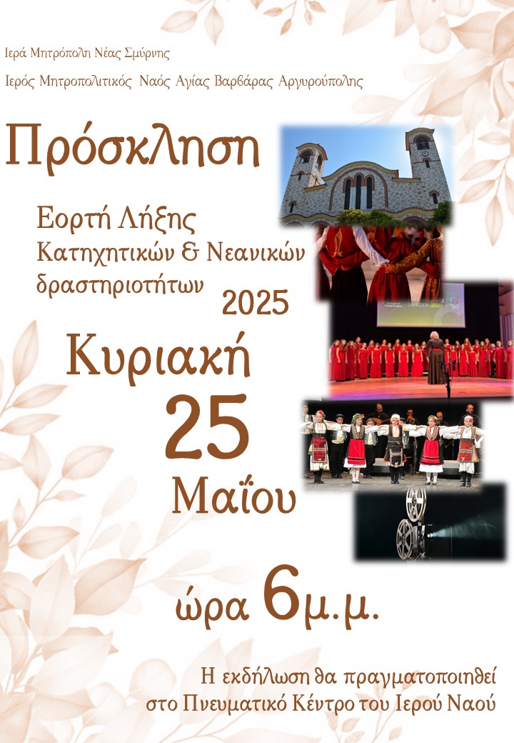 με χαρά σας προσκαλούμε στη γιορτή λήξης των Κατηχητικών και Νεανικών μας Δραστηριοτήτων, που θα πραγματοποιηθεί αυτή την Κυριακή 25 Μαΐου στις 6:00 το απόγευμα, στο Πνευματικό Κέντρο της Ενορίας μας.